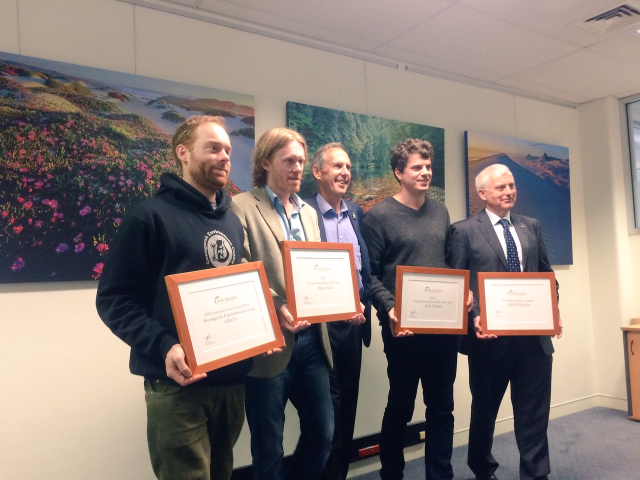 GECO campaigner Ed Hill joined Environmentalist of the Year, Peter Owen (The Wilderness Society South Australia), Young Environmentalist of the Year, Josh Creaser (350.org) at an awards ceremony in Hobart today.