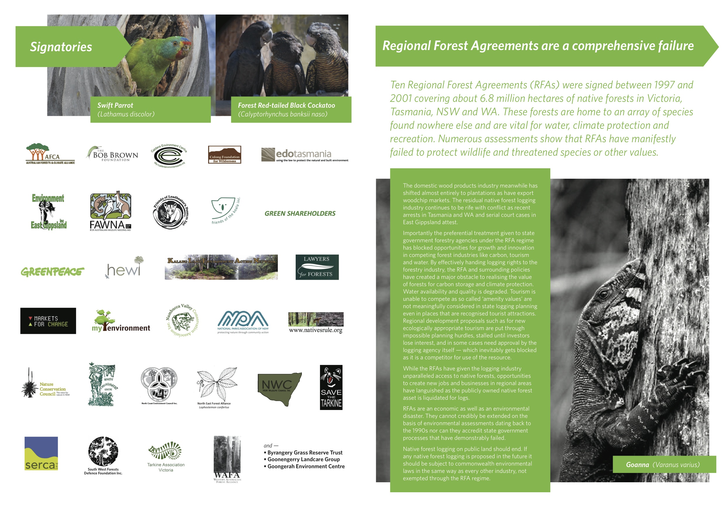 Ten Regional Forest Agreements (RFAs) were signed between 1997 and 2001 covering about 6.8 million hectares of native forests in Victoria, Tasmania, NSW and WA. These forests are home to an array of species found nowhere else and are vital for water, climate protection and recreation. Numerous assessments show that RFAs have manifestly failed to protect wildlife and threatened species or other values.