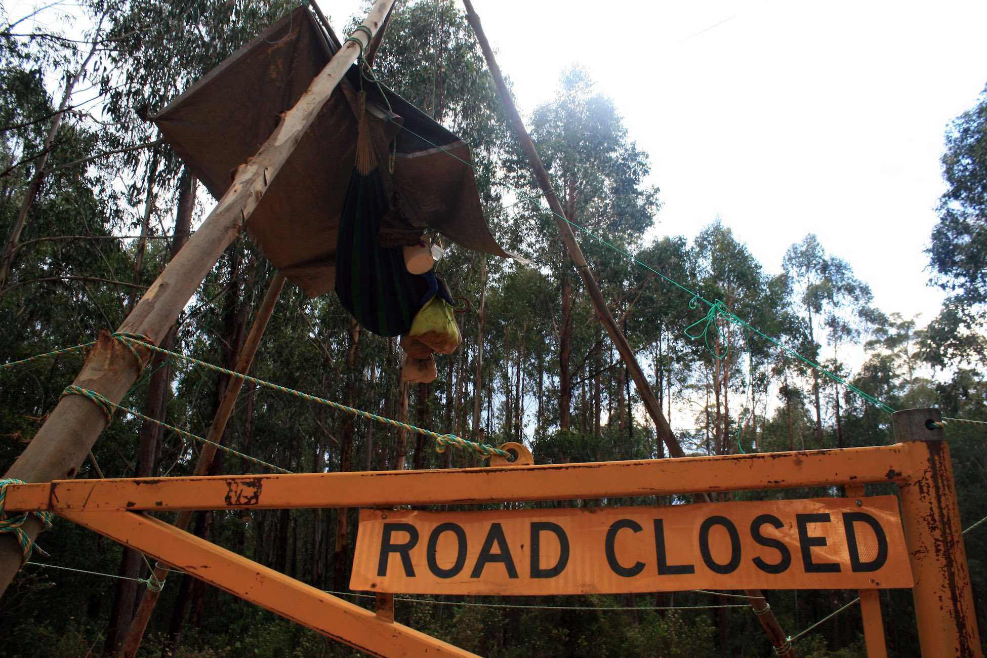 Conservationists from the Goongerah Environment Centre (GECO) continue to maintain the peaceful blockade of old growth forest at Granite Mountain in far East Gippsland that was established on Monday morning. As the blockade enters its second day a person remains suspended from a tripod structure that is attached to forestry road gate, preventing access to the old growth logging site.
